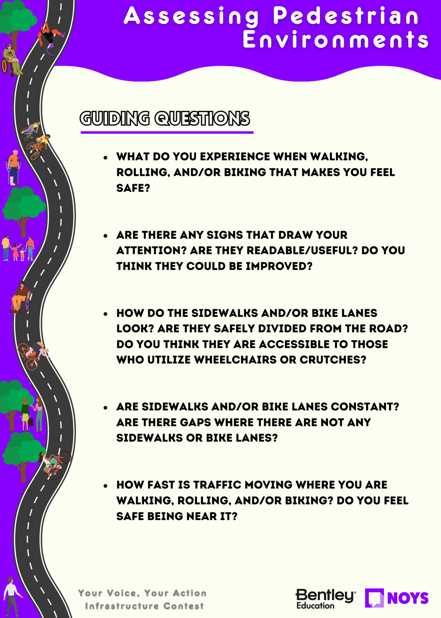 The contest aims to give young people a voice by hearing their opinions on what infrastructure improvements are needed in their neighborhoods to support safe walking, cycling, and equitable use of street spaces for all road users.